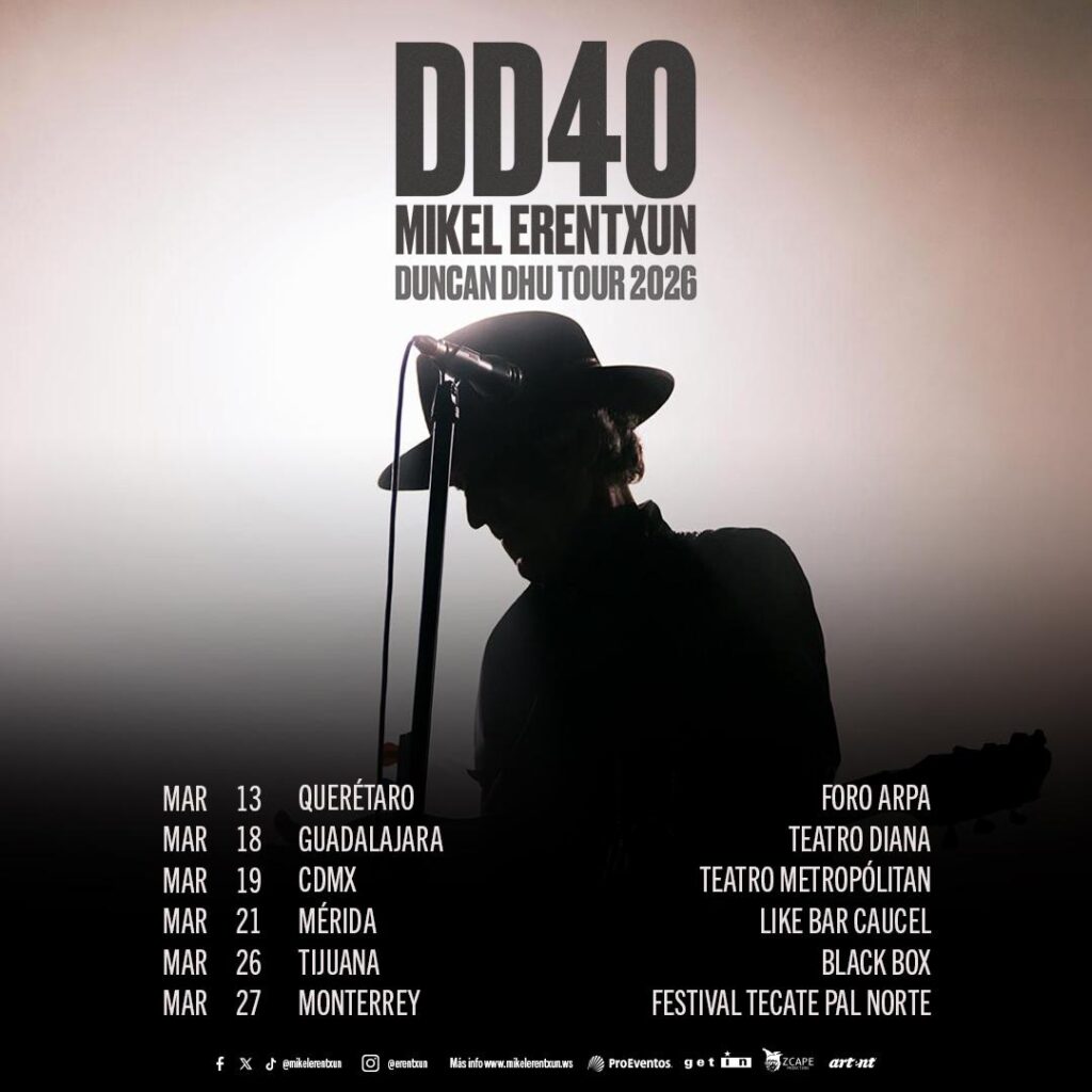 Mikel Erentxun regresa a México con una gira que será mucho más que un recorrido por distintos escenarios: será un viaje emocional a través de cuarenta años de historia, memoria y canciones que marcaron a varias generaciones. El Duncan Dhu Tour 2026 llegará al país como una celebración profunda y luminosa del legado de la banda donostiarra, un homenaje vital que Erentxun emprende en solitario, pero acompañado por la huella imborrable que Duncan Dhu dejó en la música en español. Sobre el escenario lo acompañarán Rubén Caballero en la guitarra, Mikel Azpiroz en los teclados, Fernando Neira en el bajo e Igor Telletxea en la batería, un ensamble que dará vida a los clásicos con la elegancia y la fuerza que merecen.
