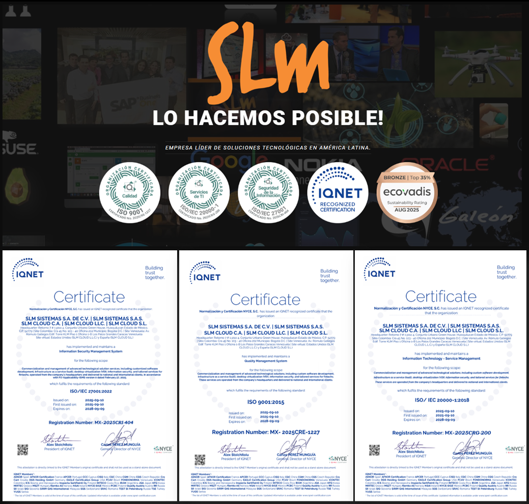 Con presencia en México, Colombia, Venezuela, Estados Unidos y España, SLM se certifica en calidad, seguridad de la información y gestión de servicios, consolidando su compromiso con la excelencia operativa y la confianza tecnológica global